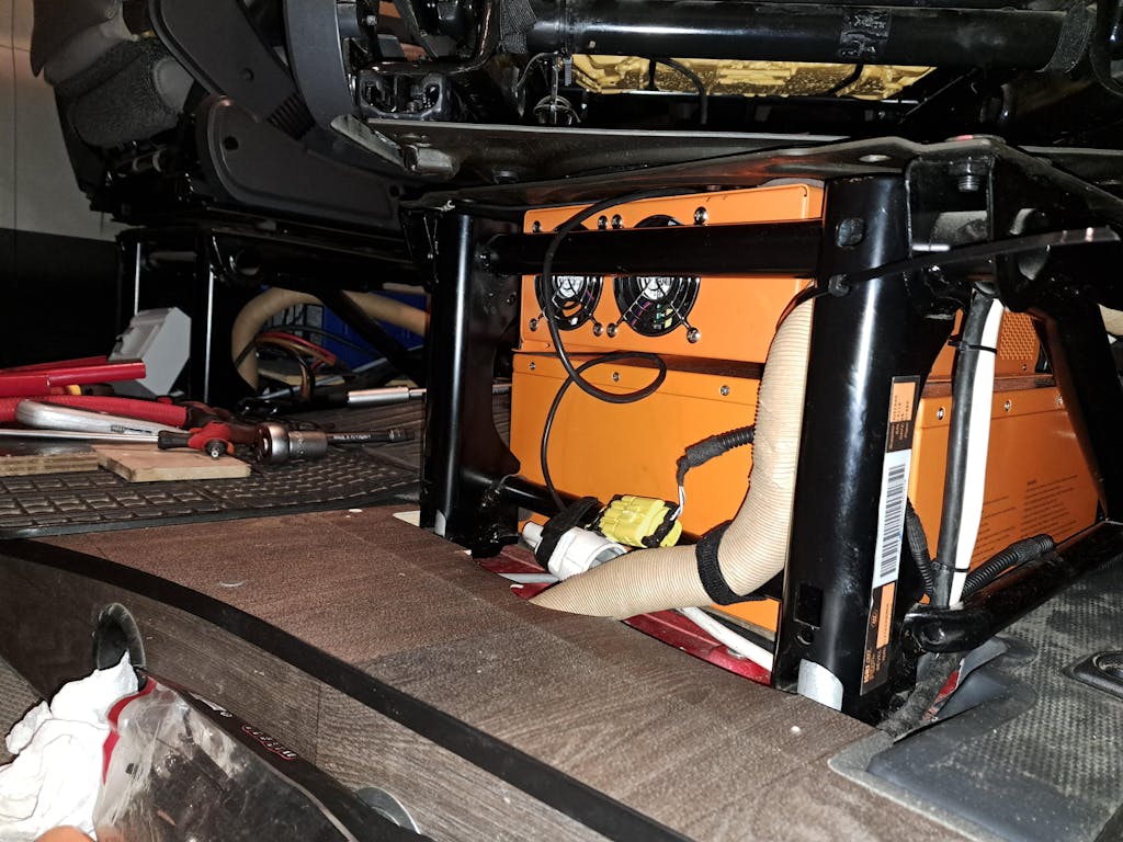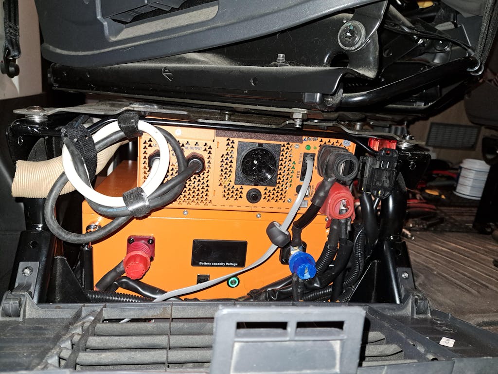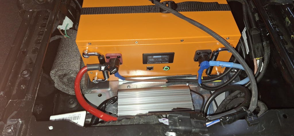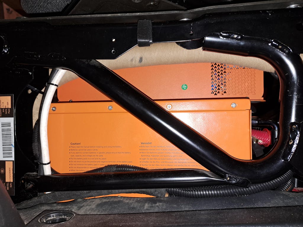 Taille de la batterie : 340*302*147 mm. Peut être placé parfaitement horizontalement sous le siège.